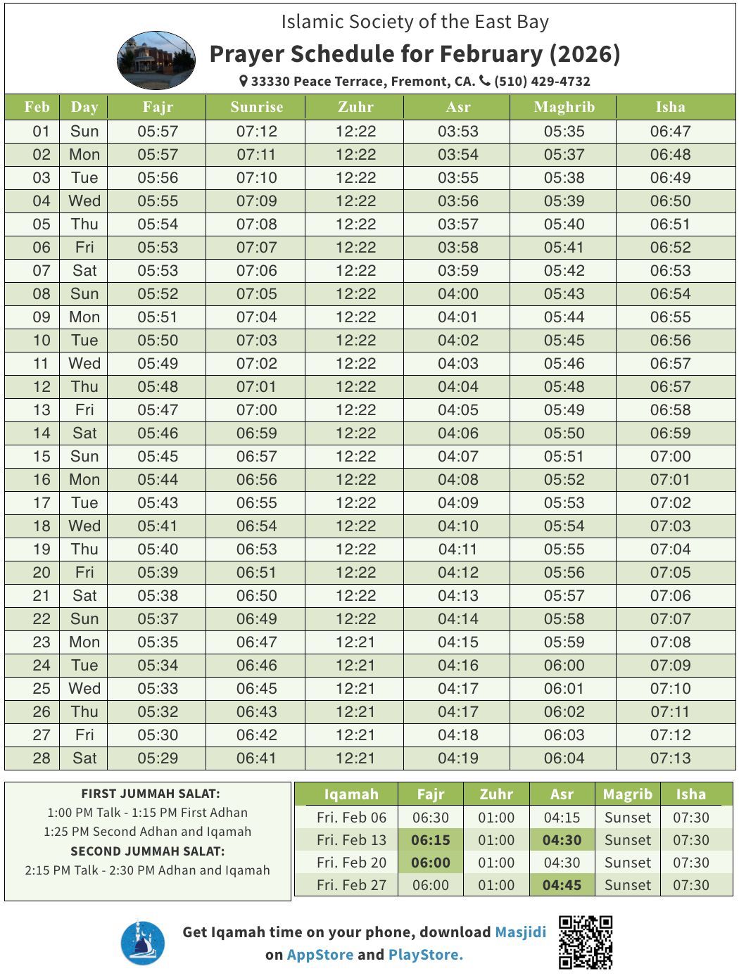 | Prayer | Adhan | Iqama |