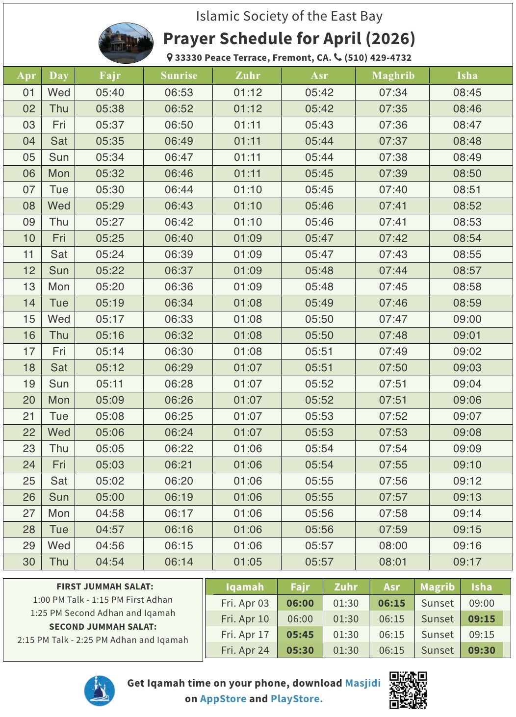 | Prayer | Adhan | Iqama |