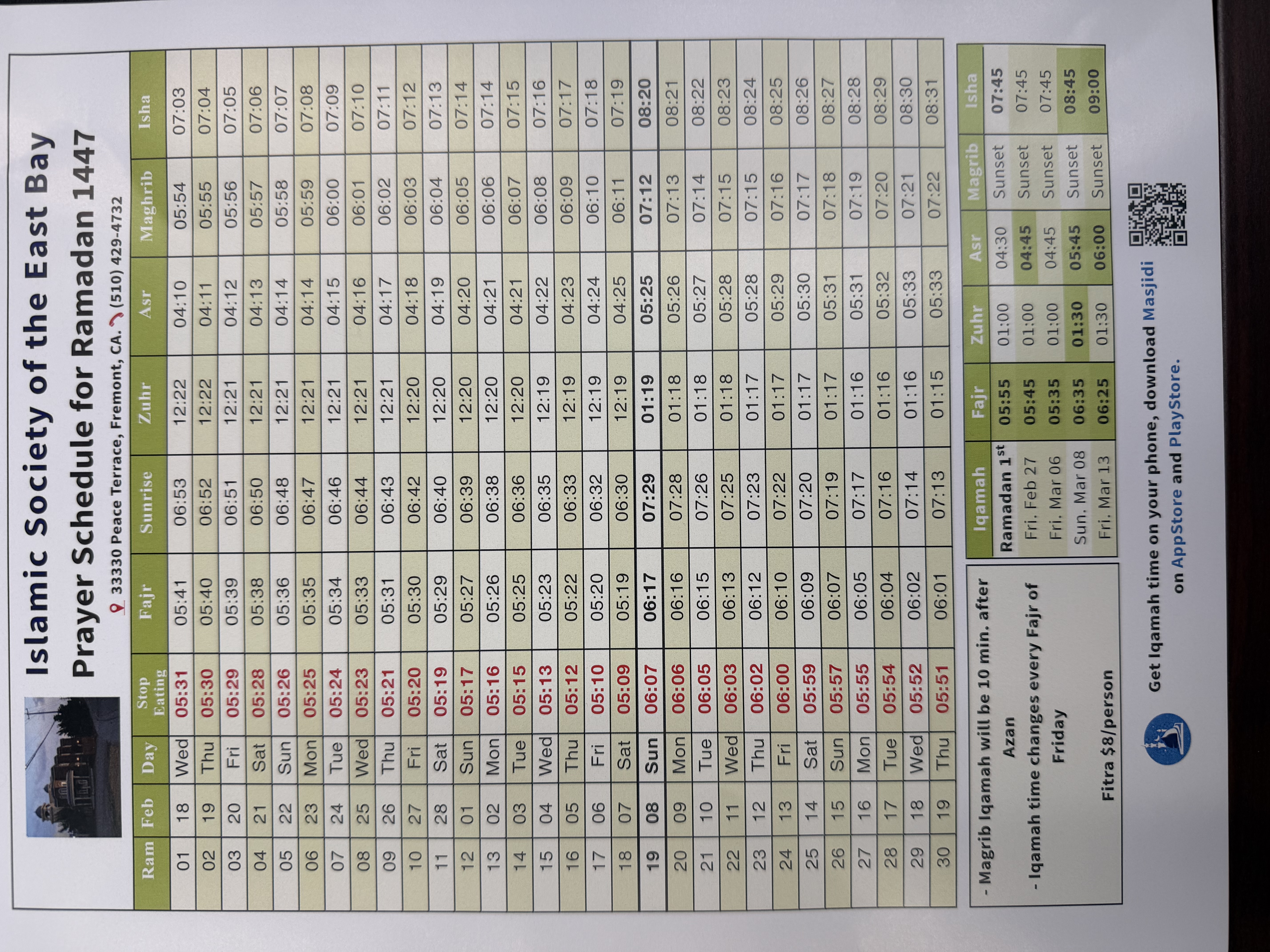 | Prayer | Adhan | Iqama |